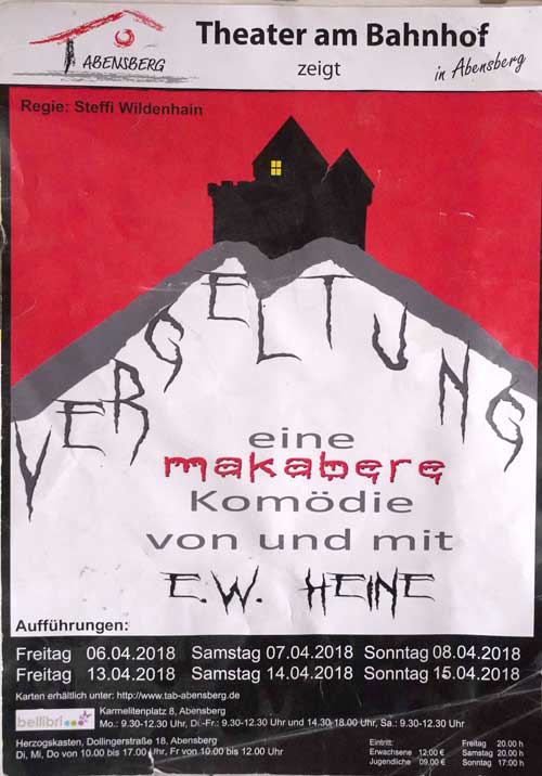 Erstaufführung am 6. April 2018 im Theater am Bahnhof in Abensberg Eine von der Außenwelt abgeschnittene Burg in den Bergen, eine wohnhafte Gräfin und ihre beiden undurchsichtigen Hausangestellten, dazu ein hoher Geistlicher aus Rom, der ausgerechnet hier an die Pforte klopft. Das sind die Zutaten für eine makabre Komödie von und mit E.W. Heine.